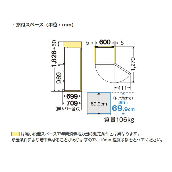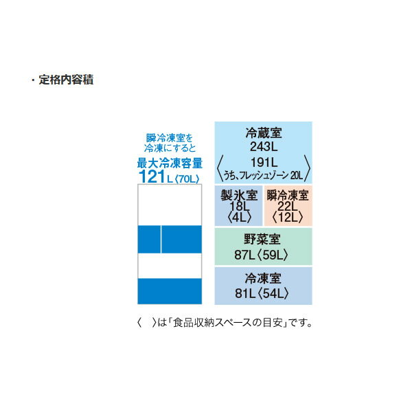 ■ 三菱電機 ■◆ 主な特長 ◆◆ 主な仕様 ◆定格内容積451L各室容量冷蔵243L製氷室18L、瞬冷凍室22L野菜室87L冷凍室81L外形寸法幅600×奥行699×高さ1,826mm必要設置スペース幅610×奥行709×高さ1,876mm質量103kg年間消費電力量(50/60Hz)255kWh/年(JIS C 9801-3:2015)